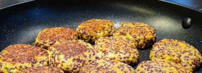 Ca. 12 Bratlinge formen und auf kleiner Stufe in Öl braten (5-7 Minuten auf jeder Seite, erst wenden, wenn die Unterseite knusprig gebraten ist)